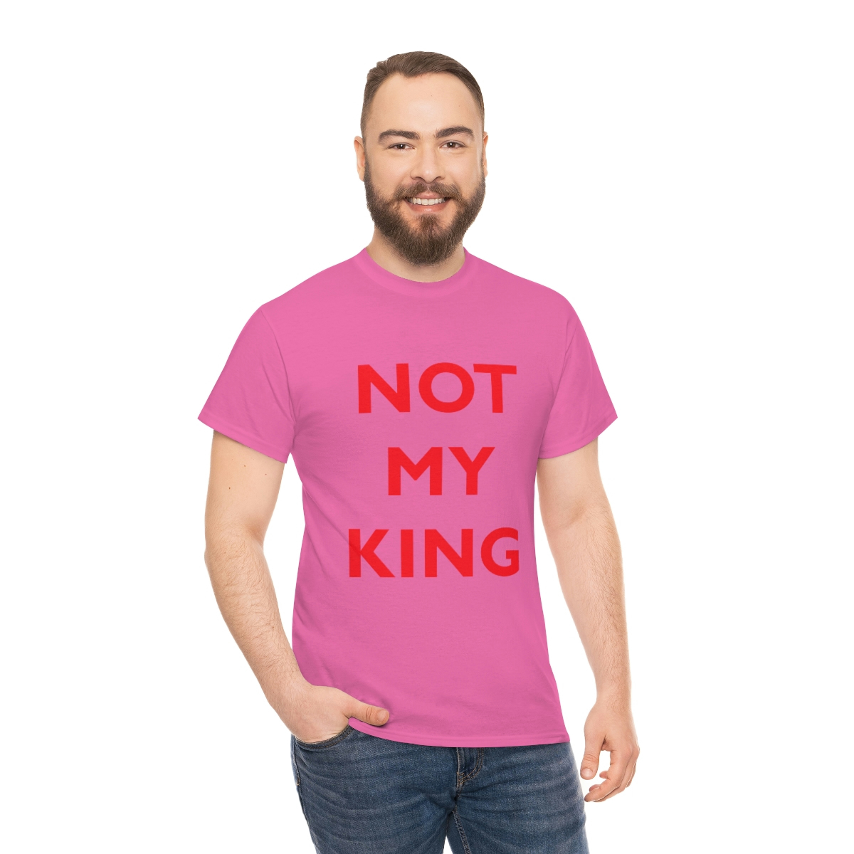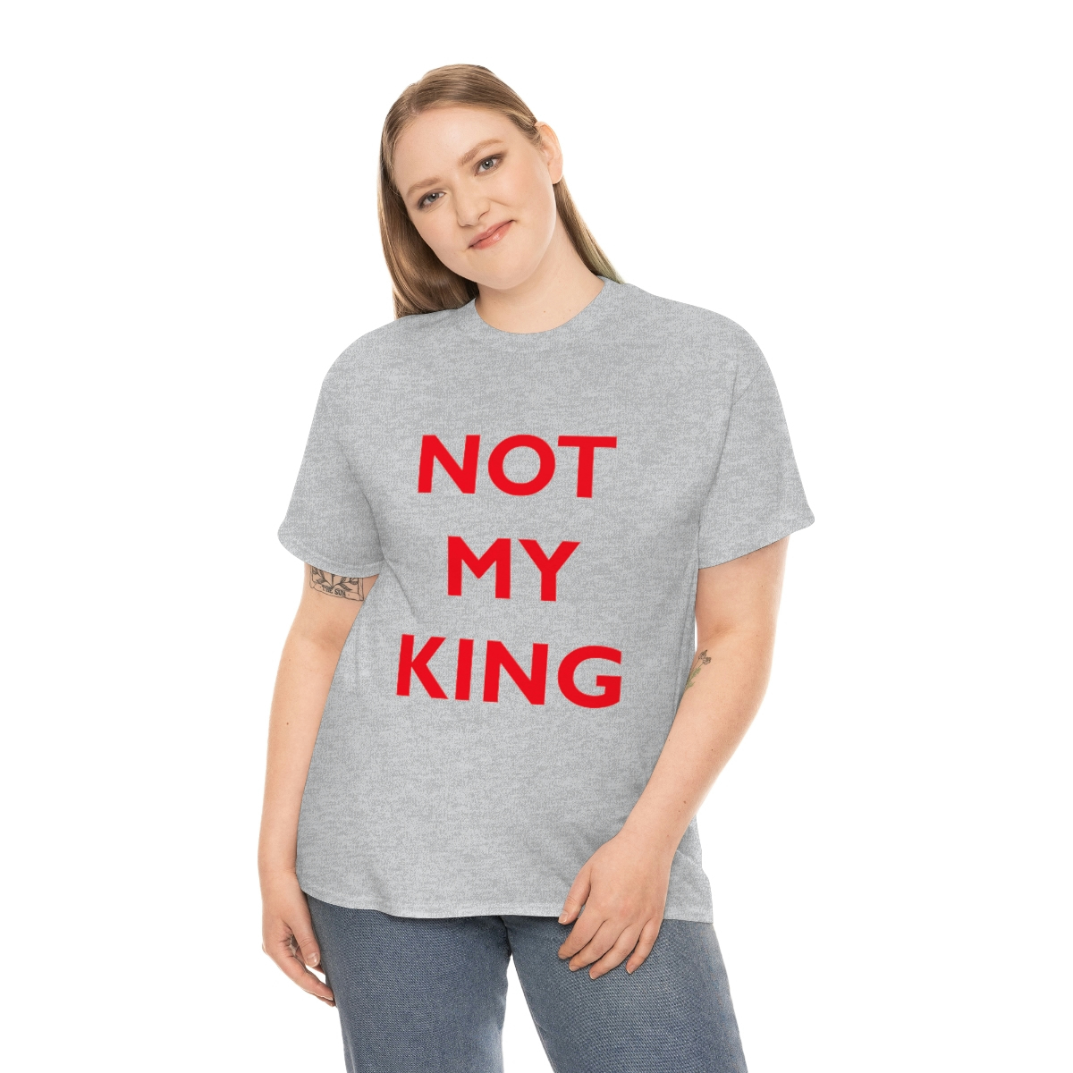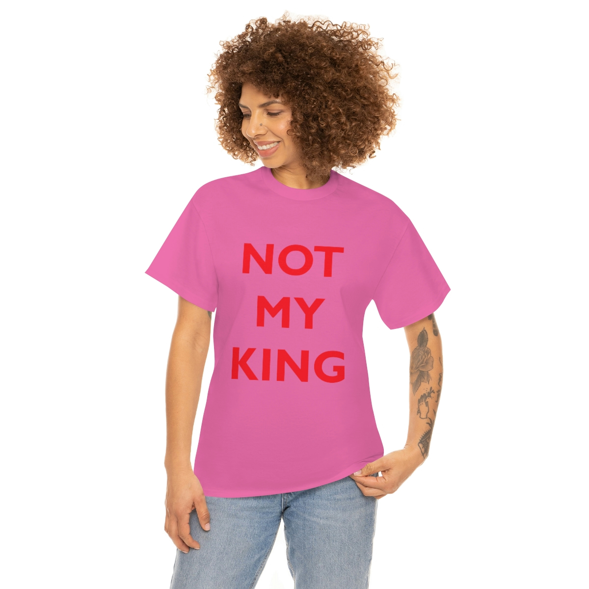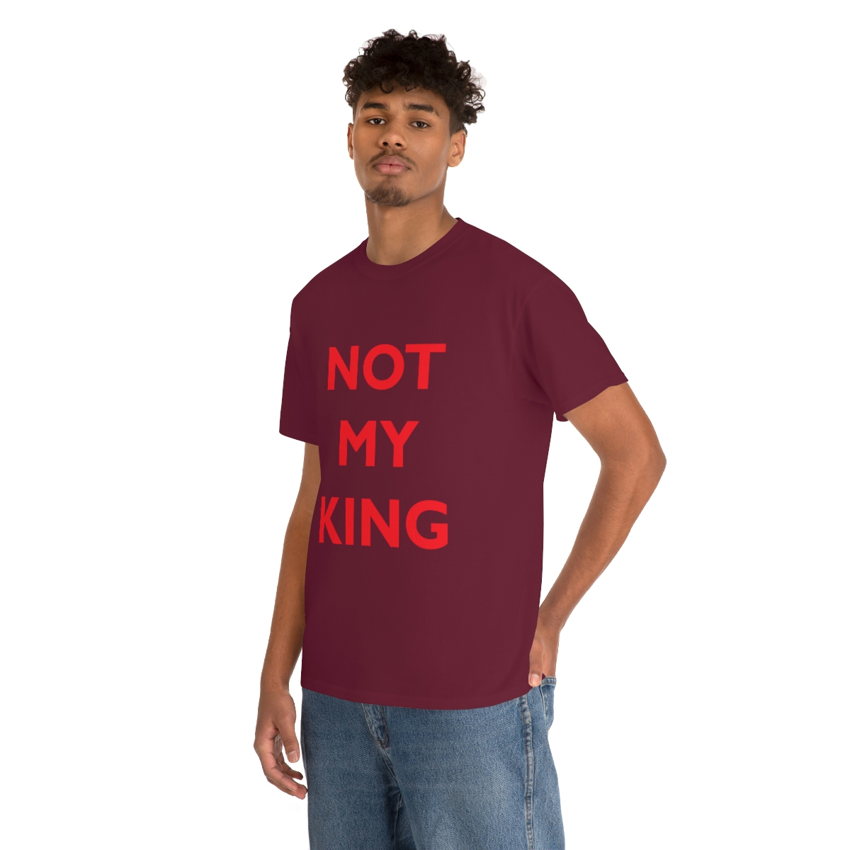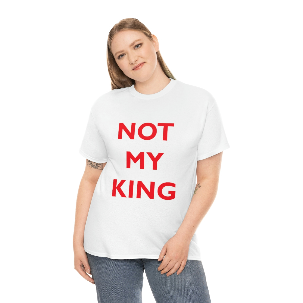 The NOT MY KING heavy cotton tee is the basic staple of any wardrobe. It is the foundation upon which casual fashion grows. No side seams mean there are no itchy interruptions under the arms. The shoulders have tape for improved durability.